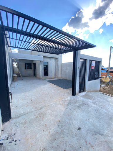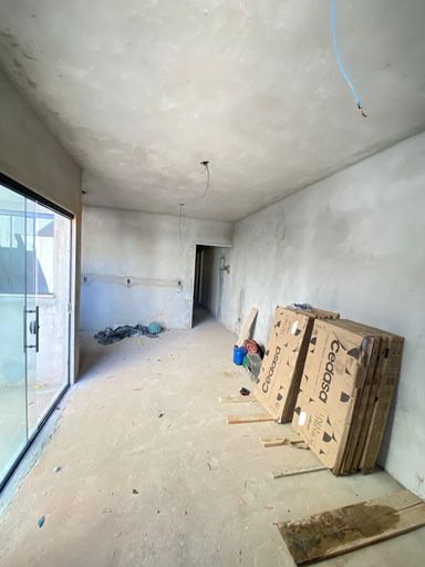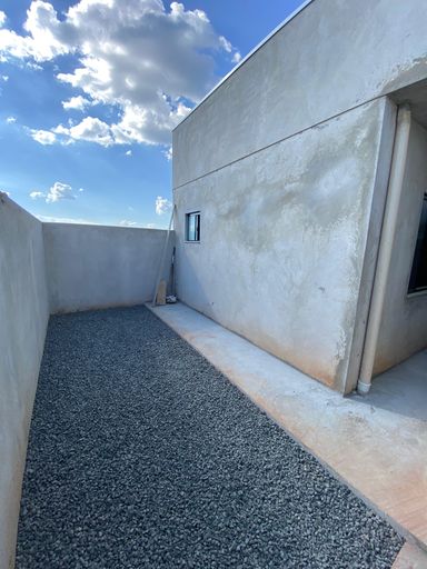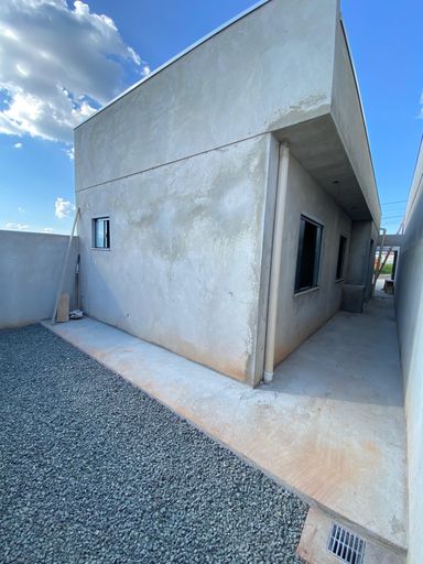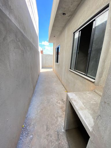 Possui uma sala integrada com a cozinha, 2 quartos sendo 1 suíte, área de serviço coberta, corredor lateral, espaço de terreno aos fundos, espaço para 2 carros, portão basculante